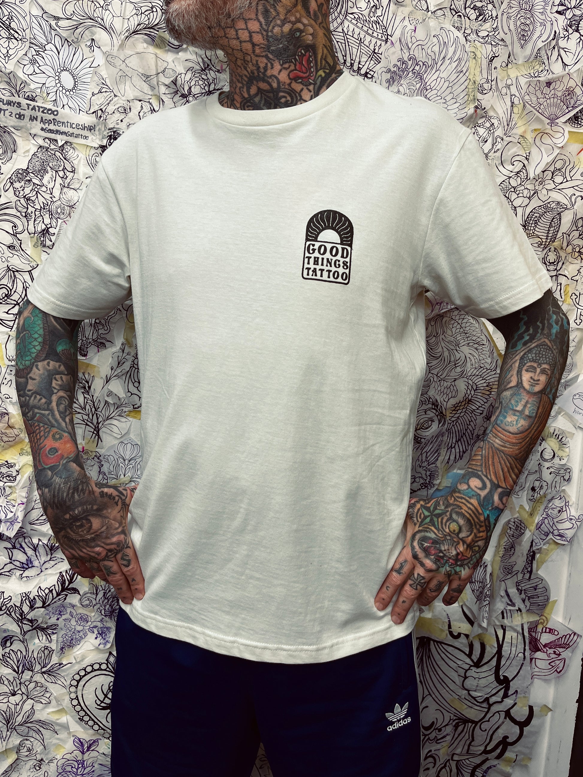 Cream Cotton Men’s fit Tee with front logo print and back 3 colour print.